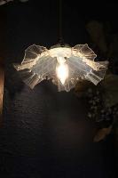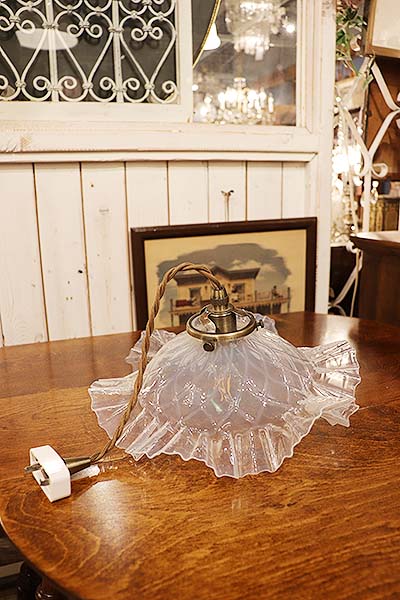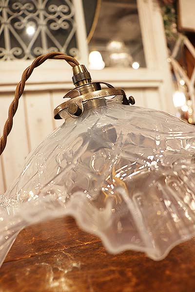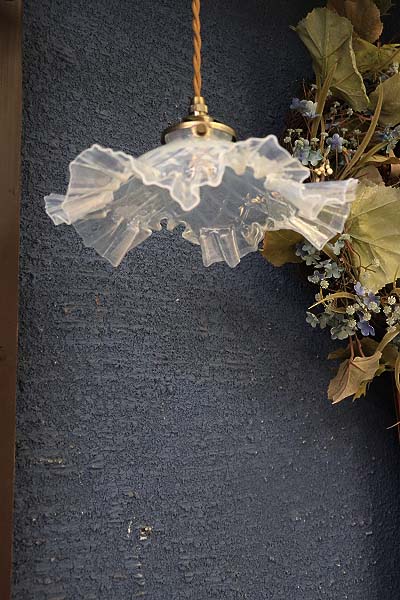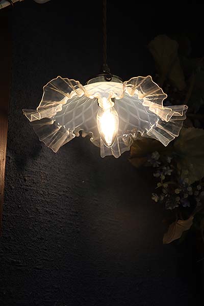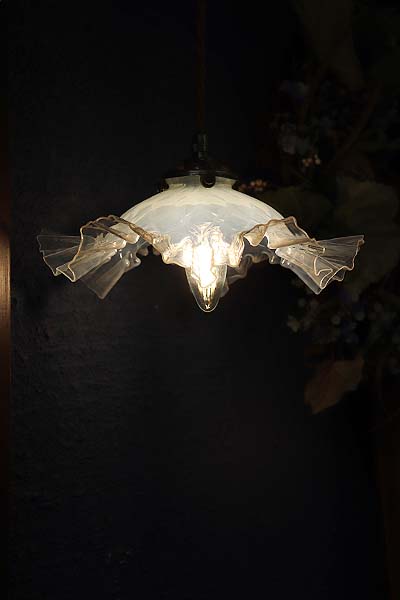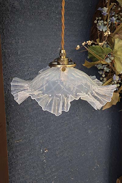 繊細なフリルのフォルムと、乳白色にやわらかく広がるグラデーションが美しい、オパールセントグラスのペンダントランプです。