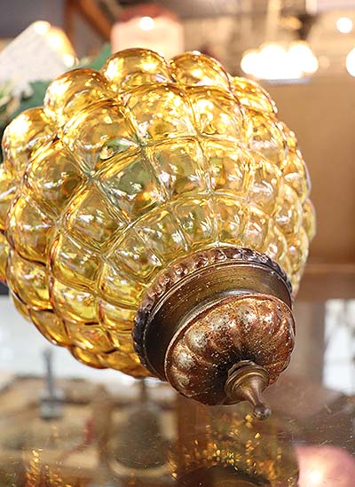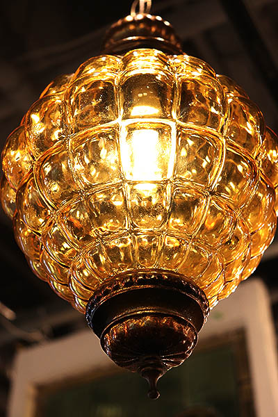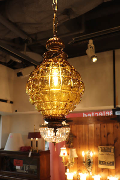 メロンほどの大きさのヴィンテージグラスのハンギングランプです。
