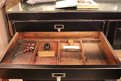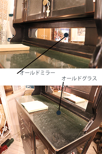天板には深みのあるオールドガラスセットされていて書き物をしたり、アクセサリー小物雑貨などの展示台としても機能します。