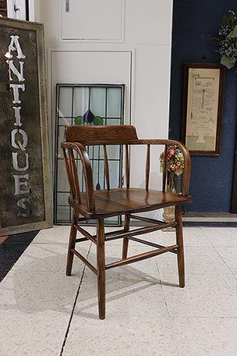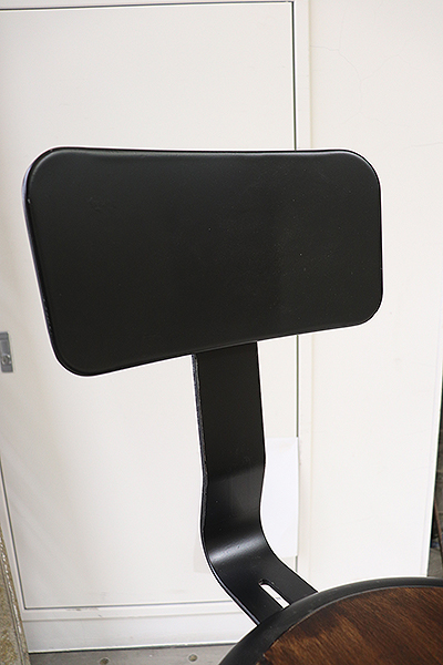 曲線的なフォルムと幾何学的なラインが同居する美しい造形の脚部。オールドスチール、アイアンの無骨さと木部の温かみが組み合わさり、実用性とインテリア性を両立した一脚です。