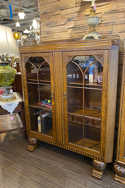 アーチ型の美しいガラス組みと、繊細なハンドカービングが映える上質な一台。