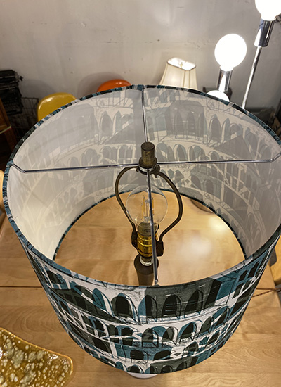 英国LIBERTY社の幾何学デザインのファブリックで張替えを施したランプシェードがアクセントとなり、